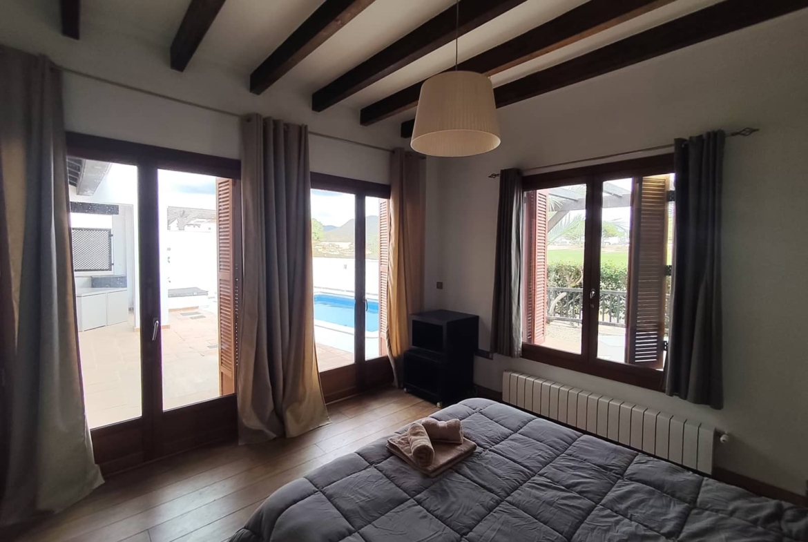 This unique villa, one of only 4 under build villa Alcors, originally built for the Polaris World directors. The moment you walk through the double entrance doors into the large vaulted ceiling of the large extended lounge you have the feeling of space. Many of the features here are exclusive to this villa, include a fire place with wood burner and feature chimney, timber ceiling joists, arched wooden windows above 3 pairs of French doors opening onto the newly tiles surround of the swimming pool, and golf course. To the left are large double glazed sliding doors to the covered area.